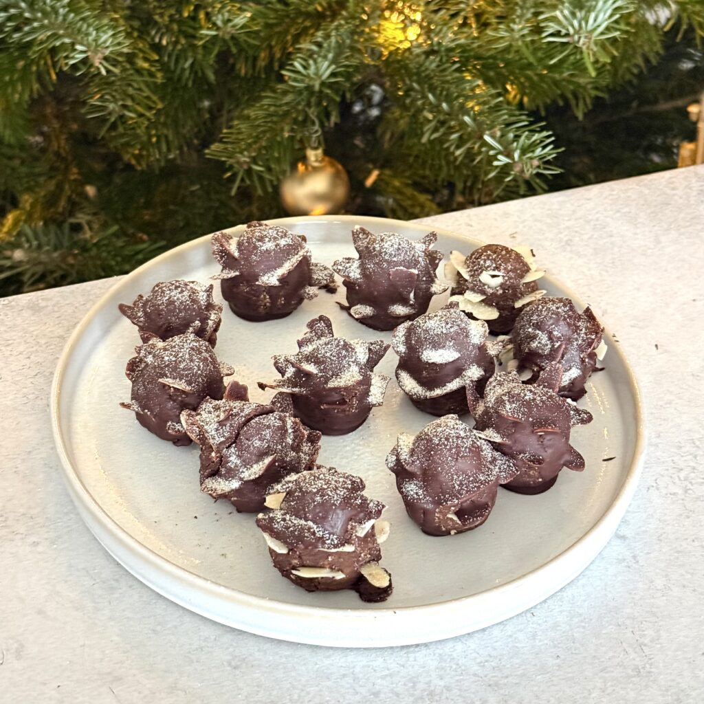 Darüber hinaus sind Süßkartoffeln nicht nur praktisch für süße Rezepte, sondern auch aus ernährungsphysiologischer Sicht echte Alleskönner. Sie liefern viele Ballaststoffe, die die Verdauung fördern und lange satt machen. Außerdem enthalten sie Beta-Carotin, eine Vorstufe von Vitamin A, das für Haut, Augen und das Immunsystem wichtig ist. Zusätzlich versorgen sie den Körper mit Vitamin C für die Abwehrkräfte, Vitamin B6 für den Energiestoffwechsel sowie Kalium, das eine zentrale Rolle für Muskeln, Nerven und den Flüssigkeitshaushalt spielt. Im Vergleich zu stark verarbeiteten Süßungsmitteln lassen Süßkartoffeln den Blutzuckerspiegel langsamer ansteigen und sorgen dadurch für eine gleichmäßigere Energieversorgung. So bringen sie nicht nur eine tolle Konsistenz, sondern auch viele wertvolle Nährstoffe in die Schoko-Tannenzapfen.